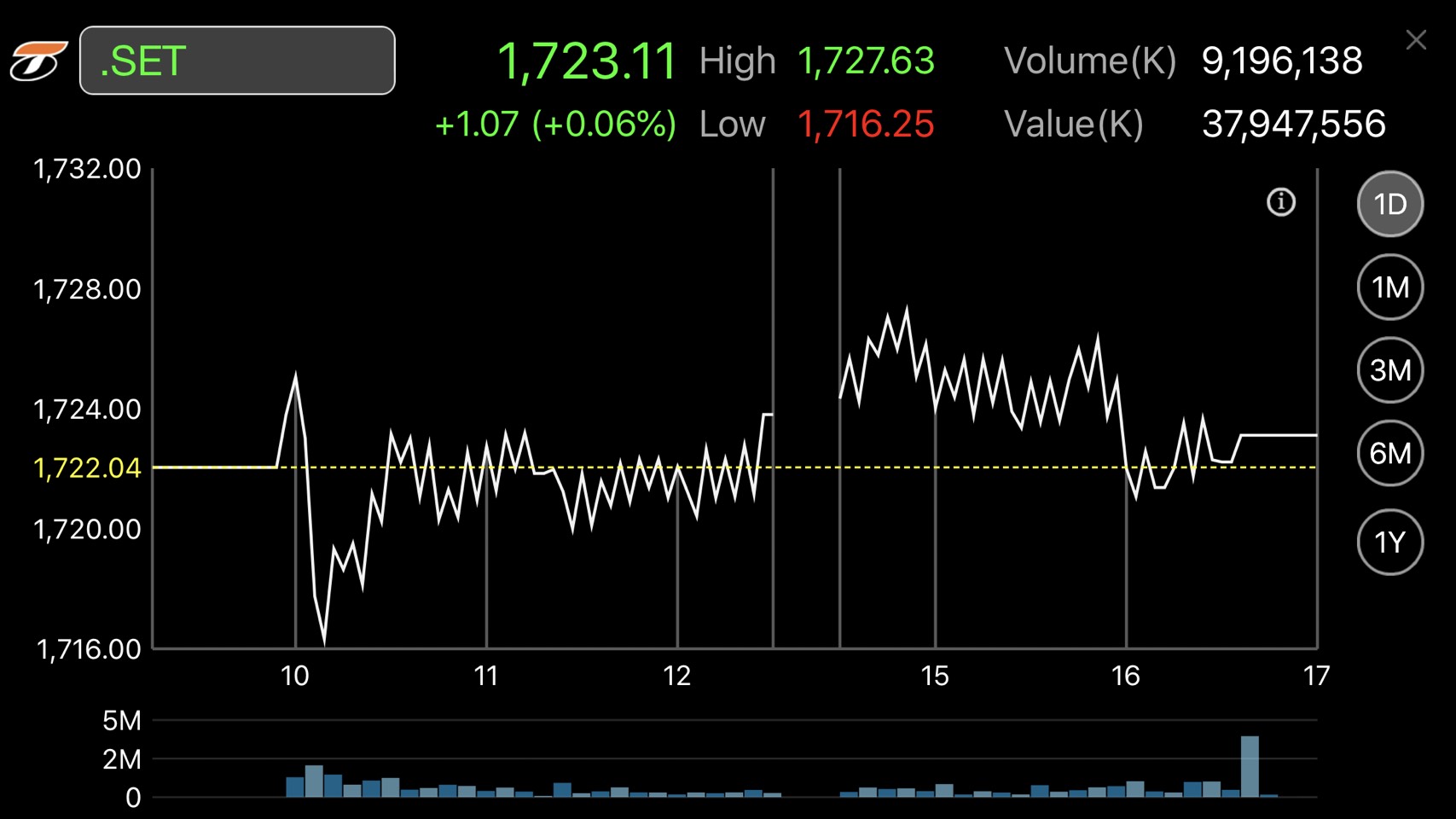 ผู้สื่อข่าวรายงานว่าดัชนีตลาดหลักทรัพย์ฯ ปิดการซื้อขายวันนี้ (11 มิ.ย.) ที่ระดับ 1,723.11 จุด เพิ่มขึ้น 1.07 จุด หรือร้อยละ 0.06 มูลค่าการซื้อขายเบาบาง 37,947.55 ล้านบาท การเคลื่อนไหวของดัชนีหุ้นไทยวันนี้ดัชนีแกว่งตัวแคบ ๆ สูงสุดของวันที่ระดับ 1,727.63 จุด และต่ำสุดของวันที่ระดับ1,716.25 จุด