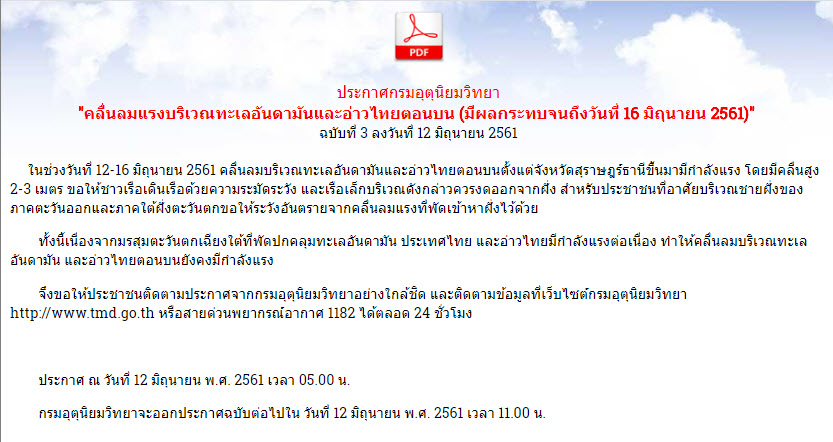อนึ่ง ช่วงวันที่ 12-16 มิถุนายน 2561 คลื่นลมบริเวณทะเลอันดามันและอ่าวไทยตอนบนตั้งแต่จังหวัดสุราษฎร์ธานี ขึ้นมา มีกำลังแรง คลื่นสูง 2-3 เมตร ขอให้ชาวเรือเดินเรือด้วยความระมัดระวัง และเรือเล็กบริเวณดังกล่าวควรงดออกจากฝั่ง สำหรับประชาชนที่อาศัยบริเวณชายฝั่งของภาคตะวันออกและภาคใต้ฝั่งตะวันตกขอให้ระวังอันตรายจากคลื่นลมแรงที่พัดเข้าหาฝั่งไว้ด้วย