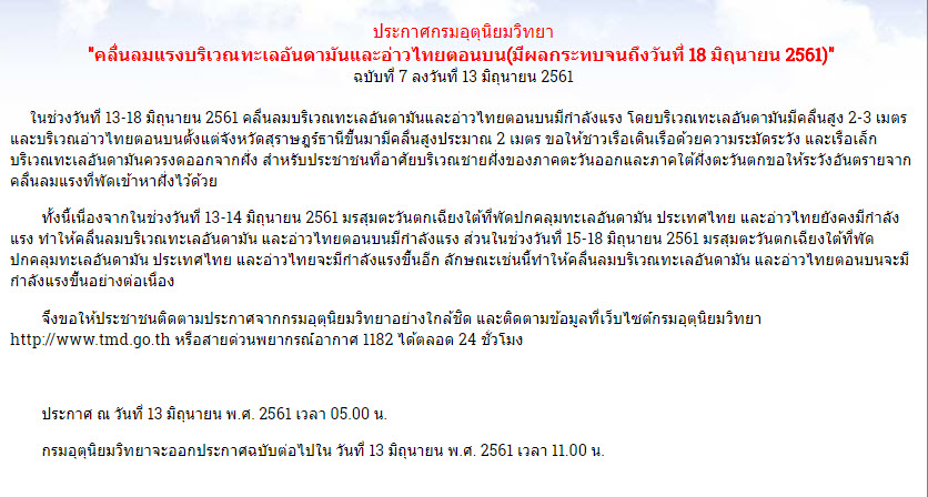ส่วนช่วงวันที่ 13-18 มิถุนายน 2561 คลื่นลมบริเวณทะเลอันดามันและอ่าวไทยตอนบนมีกำลังแรง โดยบริเวณทะเลอันดามันมีคลื่นสูง 2-3 เมตร และบริเวณอ่าวไทยตอนบนตั้งแต่ จ.สุราษฎร์ธานี ขึ้นมา มีคลื่นสูงประมาณ 2 เมตร ขอให้ชาวเรือเดินเรือด้วยความระมัดระวัง และเรือเล็กบริเวณทะเลอันดามันควรงดออกจากฝั่ง สำหรับประชาชนที่อาศัยบริเวณชายฝั่งของภาคตะวันออกและภาคใต้ฝั่งตะวันตกขอให้ระวังอันตรายจากคลื่นลมแรงที่พัดเข้าหาฝั่งไว้ด้วย