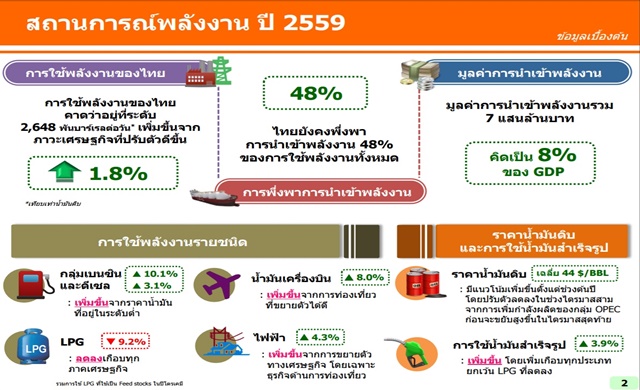 ทั้งนี้ ไทยยังพึ่งพาการนำเข้าพลังงานร้อยละ 48 มูลค่า 700,000 ล้านบาท คิดเป็นร้อยละ 8 ของจีดีพี และจากราคาน้ำมันที่ต่ำ การท่องเที่ยวขยายตัว ทำให้การใช้น้ำมันขยับเพิ่มขึ้น โดยกลุ่มเบนซินเพิ่มขึ้นร้อยละ 10.1 ดีเซลร้อยละ 3.1 น้ำมันเครื่องบินเพิ่มขึ้นร้อยละ 8 การใช้ไฟฟ้าเพิ่มขึ้นร้อยละ 4.3 สวนทางกับการใช้ก๊าซแอลพีจีที่ลดลงร้อยละ 9.2