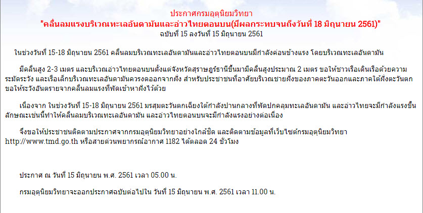 ส่วนช่วงวันที่ 15-18 มิถุนายน 2561 คลื่นลมบริเวณทะเลอันดามันและอ่าวไทยตอนบนมีกำลังค่อนข้างแรง โดยบริเวณทะเลอันดามัน มีคลื่นสูง 2-3 เมตร และบริเวณอ่าวไทยตอนบนตั้งแต่จังหวัดสุราษฎร์ธานีขึ้นมามีคลื่นสูงประมาณ 2 เมตร ขอให้ชาวเรือเดินเรือด้วยความระมัดระวัง และเรือเล็กบริเวณทะเลอันดามันควรงดออกจากฝั่ง สำหรับประชาชนที่อาศัยบริเวณชายฝั่งของภาคตะวันออกและภาคใต้ฝั่งตะวันตก ขอให้ระวังอันตรายจากคลื่นลมแรงที่พัดเข้าหาฝั่งไว้ด้วย