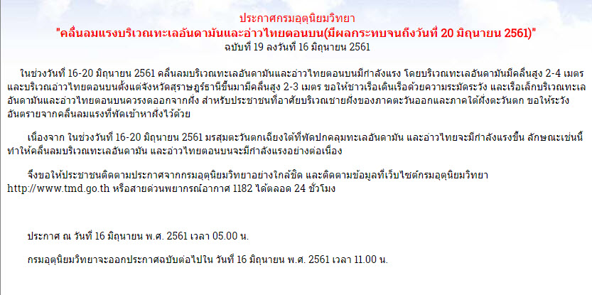 เนื่องจากในช่วงวันที่ 16-20 มิถุนายน 2561 มรสุมตะวันตกเฉียงใต้ที่พัดปกคลุมทะเลอันดามัน และอ่าวไทยจะมีกำลังแรงขึ้น ลักษณะเช่นนี้ทำให้คลื่นลมบริเวณทะเลอันดามัน และอ่าวไทยตอนบนจะมีกำลังแรงอย่างต่อเนื่อง ขอให้ประชาชนติดตามประกาศจากกรมอุตุนิยมวิทยาอย่างใกล้ชิด และติดตามข้อมูลที่เว็บไซต์กรมอุตุนิยมวิทยา http://www.tmd.go.th หรือสายด่วนพยากรณ์อากาศ 1182 ได้ตลอด 24 ชั่วโมง