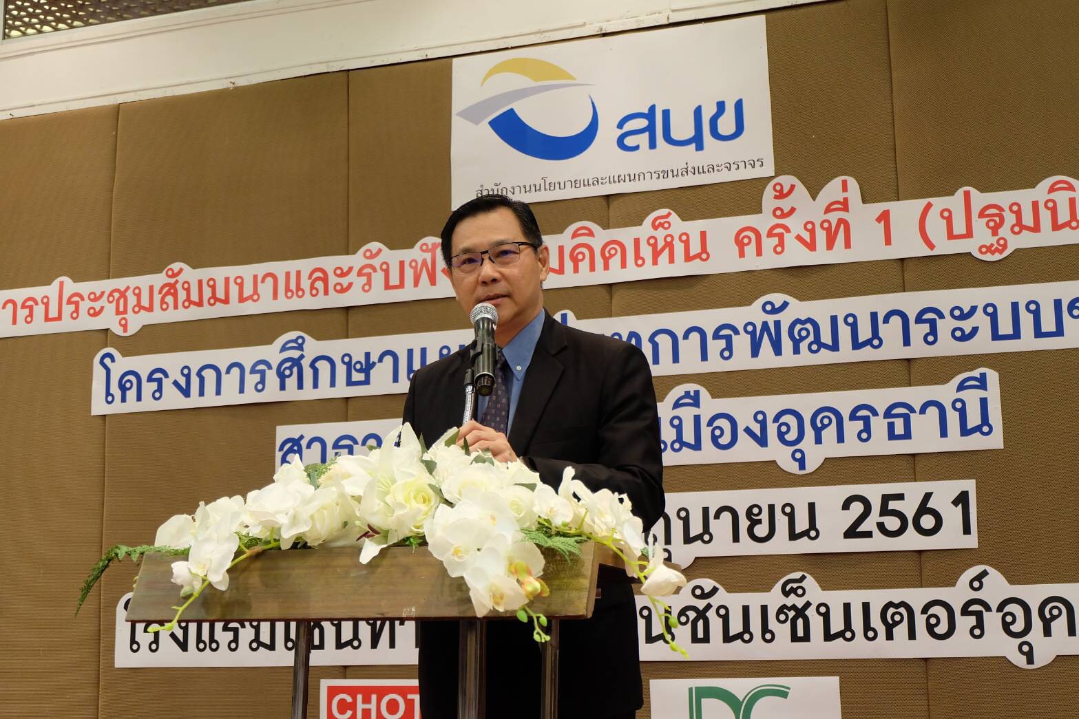 นายชัยวัฒน์ ทองคำคูณ ผู้อำนวยการ สำนักงานนโยบายและแผนการขนส่งและจราจร (สนข.) เปิดเผยภายหลังเป็นประธานเปิดการประชุมสัมมนาและรับฟังความคิดเห็น ครั้งที่ 1 โครงการศึกษาแผนแม่บทการพัฒนาระบบขนส่งสาธารณะในเขตเมืองอุดรธานี ว่า กระทรวงคมนาคมมอบหมายให้ สนข.ดำเนินโครงการศึกษาจัดทำแผนแม่บทการพัฒนาระบบขนส่งสาธารณะในเขตเมืองอุดรธานี โดยจะจัดทำแผนแม่บทระบบขนส่งสาธารณะ ออกแบบเบื้องต้นโครงการนำร่อง รวมทั้งจัดทำแผนพัฒนาพื้นที่โดยรอบสถานีและจุดจอดแล้วจร และจัดทำแผนการจัดการจราจร ซึ่งจะทำให้เมืองเกิดการพัฒนาอย่างเป็นระบบ มีการพัฒนาพื้นที่ควบคู่ไปกับการพัฒนาระบบขนส่งสาธารณะที่สามารถตอบสนองความต้องการของคนในพื้นที่ ปัญหาจราจรได้รับการแก้ไข ด้วยระบบขนส่งสาธารณะที่มีประสิทธิภาพ เชื่อมต่อและอำนวยความสะดวกการเดินทาง ซึ่งถือเป็นการดำเนินโครงการพัฒนาระบบโครงสร้างพื้นฐานที่มีความสอดคล้องและเป็นไปตามแผนพัฒนาฯ ฉบับที่ 12 รวมทั้งนโยบายของรัฐบาลและกระทรวงคมนาคมที่จะกระจายความเจริญสู่เมืองในภูมิภาคด้วยระบบขนส่งสาธารณะที่ทันสมัยและมีประสิทธิภาพ