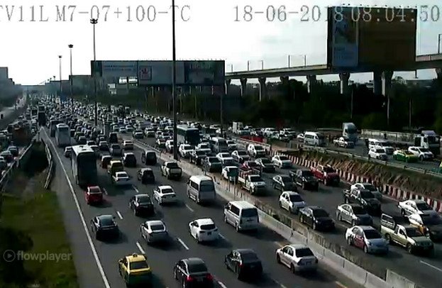มอเตอร์เวย์(ทล.7) ขาเข้า กม.10 – กม.0 รถมาก เคลื่อนตัวช้า สลับหยุดนิ่ง