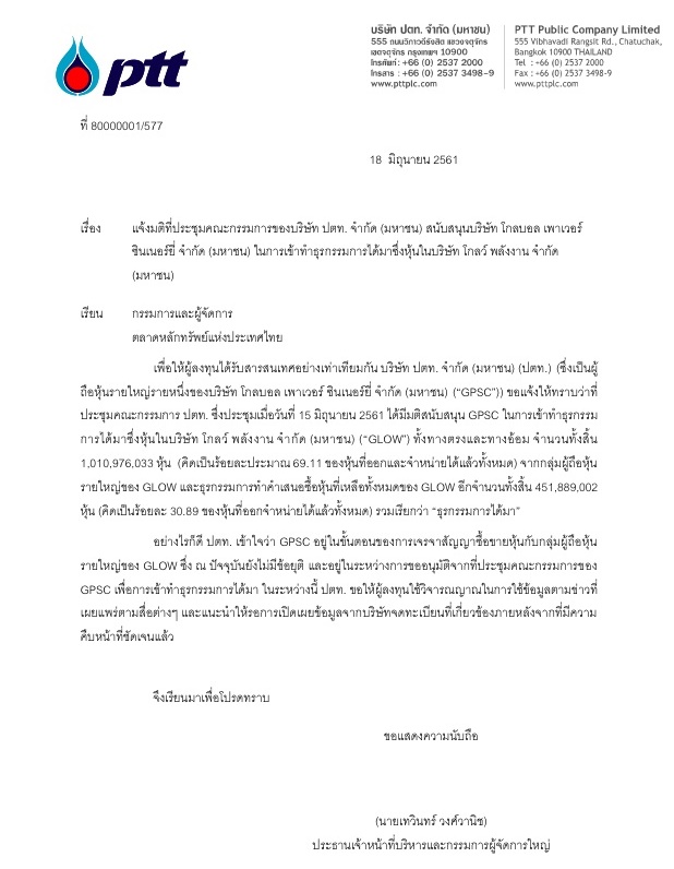 นายเทวินทร์ วงศ์วานิช ประธานเจ้าหน้าที่บริหารและกรรมการผู้จัดการใหญ่ บริษัท ปตท. จำกัด (มหาชน) หรือ PTT แจ้งตลาดหลักทรัพย์แห่งประเทศไทย (ตลท.) ว่า ที่ประชุมคณะกรรมการบริษัทเมื่อวันที่ 15 มิถุนายนที่ผ่านมามีมติสนับสนุนบริษัท โกลบอล เพาเวอร์ ซินเนอร์ยี่ จำกัด (มหาชน) หรือ GPSC ซึ่งเป็นบริษัทลูกในการเข้าทำธุรกรรมการได้มาซึ่งหุ้นในบริษัท โกลว์ พลังงาน จำกัด (มหาชน) หรือ GLOW ทั้งทางตรงและทางอ้อมจำนวน 1,010,976,033 หุ้น คิดเป็นร้อยละประมาณ 69.11 ของหุ้นที่ออกและจำหน่ายได้แล้วทั้งหมด จากกลุ่มผู้ถือหุ้นรายใหญ่ของ GLOW และธุรกรรมการทำคำเสนอซื้อหุ้นที่เหลือทั้งหมดของ GLOW อีกจำนวน 451,889,002 หุ้น คิดเป็นร้อยละ 30.89 ของหุ้นที่ออกจำหน่ายได้แล้วทั้งหมด รวมเรียกว่า “ธุรกรรมการได้มา”