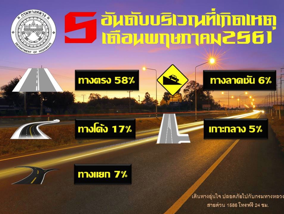 กรมทางหลวง โดยสำนักอำนวยความปลอดภัย ได้สรุปรายงานข้อมูลอุบัติเหตุบนทางหลวงทั่วประเทศ เดือนพฤษภาคม 2561 จากการรายงานอุบัติเหตุทางระบบ HAIMS พบว่า อุบัติเหตุเกิดขึ้นบนทางหลวงในความรับผิดชอบของกรมทางหลวง 895 ครั้ง ทำให้มีผู้เสียชีวิต 142 คน ได้รับบาดเจ็บทั้งสิ้น 716 คน จำนวนรถที่เกิดอุบัติเหตุ 1,181 คัน เป็นเหตุให้ทรัพย์สินของกรมทางหลวงเสียหายประมาณ 13 ล้านบาท เมื่อเปรียบเทียบสถิติอุบัติเหตุเดือนพฤษภาคม 2560 อุบัติเหตุลดลงจากปีที่ผ่านมาร้อยละ 1 ผู้เสียชีวิตลดลงร้อยละ 28 บาดเจ็บลดลงร้อยละ 9 จำนวนรถที่เกิดอุบัติเหตุลดลงร้อยละ 5 ซึ่งสาเหตุหลักการเกิดอุบัติเหตุมาจากผู้ขับขี่ขับรถด้วยความเร็วสูงกว่ากฎหมายกำหนดร้อยละ 65 (559 ครั้ง) รองลงมาได้แก่ หลับในร้อยละ 8 (67 ครั้ง) การตัดหน้าระยะกระชั้นชิดร้อยละ 7 (56 ครั้ง) และอุปกรณ์รถบกพร่องร้อยละ 4 (33 ครั้ง)