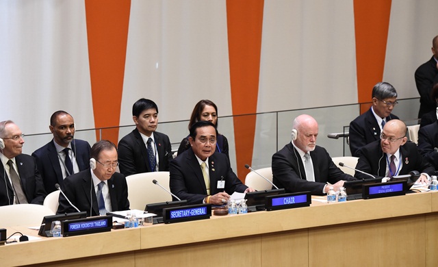 นายกรัฐมนตรี กล่าวว่า เมื่อเดือนกันยายนปีที่แล้ว ได้รับรองเป้าหมายการพัฒนาที่ยั่งยืน ภายหลังเป้าหมายการพัฒนาแห่งสหัสวรรษสิ้นสุด แต่ภัยคุกคามและความท้าทายใหม่ ๆ ยังคงมีอยู่ ทั้งการเปลี่ยนแปลงสภาพภูมิอากาศ ภัยธรรมชาติ โรคระบาด ความมั่นคงทางอาหาร-พลังงาน ภัยที่เกิดขึ้นจากมนุษย์ เช่น สงคราม นำมาซึ่งการโยกย้ายถิ่นฐานและพลัดถิ่น หลายทศวรรษที่ผ่านมา การรีบเร่งการพัฒนาเพราะเชื่อมั่นในการเติบโตทางเศรษฐกิจ จึงเกิดการแข่งขันแย่งชิงและแสวงประโยชน์ ซึ่งผู้ที่เข้มแข็งและได้เปรียบที่สุดจึงจะอยู่รอด