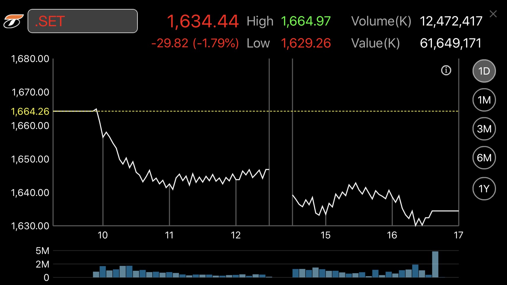 การซื้อขายหุ้นวันนี้ ดัชนีหุ้นไทยเคลื่อนไหวในแดนลบ โดยมีแรงขายออกมาอย่างต่อเนื่อง ดัชนีแตะจุดต่ำสุดที่ระดับ 1,629.26 จุด ลงไปกว่า 30 จุด และดัชนีมีจุดสูงสุดที่ 1,664.97 จุด