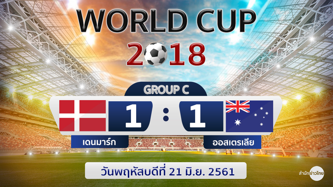 ฟุตบอลโลก 2018 รอบสุดท้ายที่ประเทศรัสเซีย คู่แรกวันนี้เป็นคิวของกลุ่ม C ระหว่าง เดนมาร์ก พบกับ ออสเตรเลีย โดยนัดแรก เดนมาร์ก ชนะ เปรู 1-0 ส่วน ออสเตรเลีย แพ้ ฝรั่งเศส 1-2 เริ่มเกมมาได้เพียง 7 นาที ทีม “โคนม” เดนมาร์ก ได้ประตูขึ้นนำจาก คริสเตียน อีริคเซ่น จอมทัพของทีม จากจังหวะต่อกันอย่างสุดสวยจบลงด้วยลูกยิงแบบฮาล์ฟวอลเลย์เข้าไป หลังจากนั้น เดนมาร์ก ก็ยังครองเกมได้มากกว่า แต่นาทีที่ 35 เดนมาร์ก ต้องมาเสียลูกโทษที่จุดโทษ หลังผู้เล่นไปไปทำแฮนด์บอล ซึ่งผู้ตัดสินต้องใช้ VAR ขอดูภาพช้าและให้เป็นจุดโทษ ก่อนที่ ไมล์ เยดินัค แนวรับกัปตันทีมออสเตรเลีย ซัดเข้าไปไม่เหลือ จบครึ่งแรกเสมอกันไป 1-1