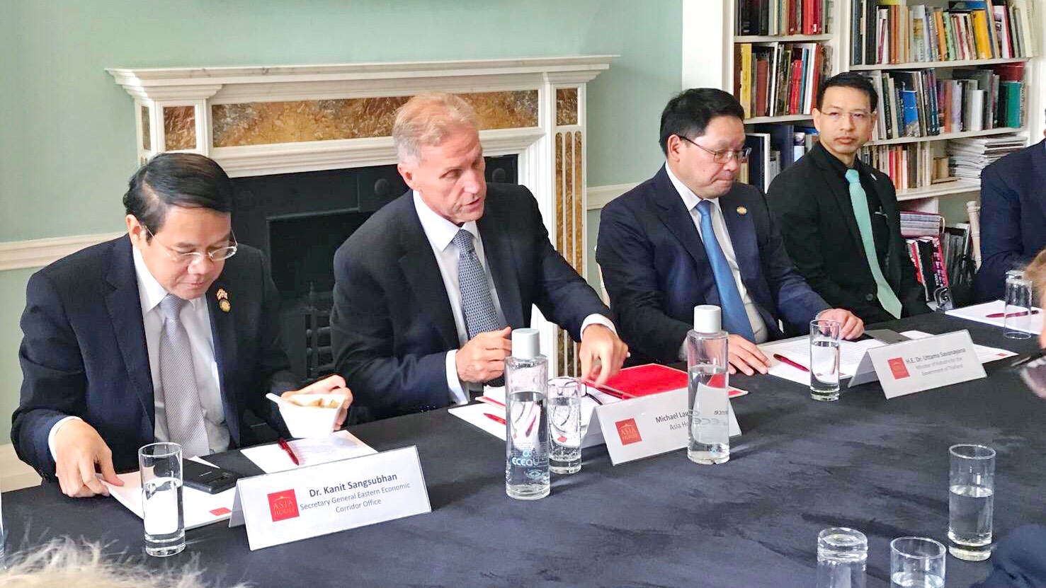 นายอุตตม สาวนายน รัฐมนตรีว่าการกระทรวงอุตสาหกรรม และนายคณิศ แสงสุพรรณ เลขาธิการสำนักงานเขตพัฒนาพิเศษภาคตะวันออกหรืออีอีซี ประชุมโต๊ะกลมร่วมกับนักลงทุนอังกฤษที่เอเชียเฮ้าส์ ณ กรุงลอนดอน ประเทศอังกฤษ โดยมีนักธุรกิจบริษัทชั้นนำ อาทิ ARUP HSBC KPMG SHELL PRUDENTIAL และ WOOD PLC รวมกว่า 20 รายเข้าร่วมการหารือ