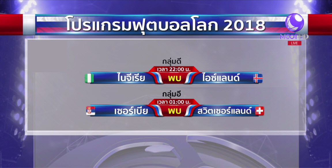 รัสเซีย 22 มิ.ย.-กุนซือไนจีเรียจัดทัพชุดใหญ่ ที่มีวิคเตอร์ โมเซส และอเล็กซ์ อิโวบี หวัง 3 คะแนน ลงสนามพบ ไอซ์แลนด์ ที่มี อัลเฟรด ฟินน์โบกาสัน เป็นกองหน้า ส่วนเซอร์เบียหวัง 3 แต้ม การันตีเข้ารอบ ขณะที่สวิตเซอร์แลนด์ ต้อง 3 คะแนนเท่านั้น เพื่อต่อลมหายใจ ศึกฟุตบอลโลก คืนนี้