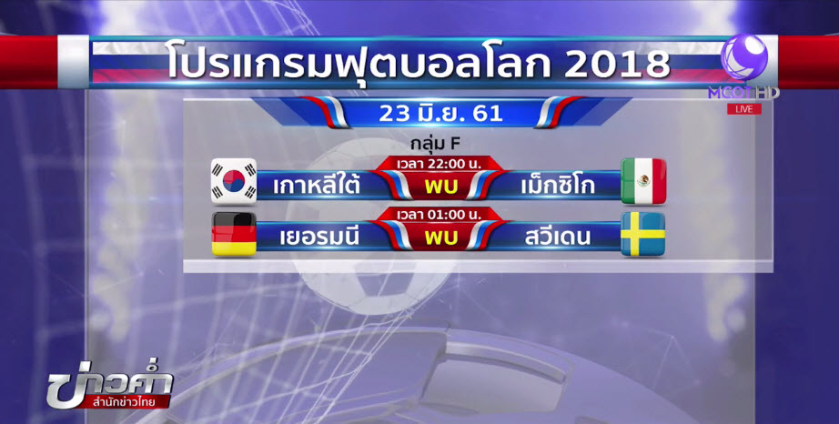 รัสเซีย 23 มิ.ย.-ฟุตบอลโลก 2018 คืนนี้ เป็นนัดที่ 2 กลุ่มเอฟ เยอรมนี พบกับ สวีเดน ในเวลา 01.00 น. ส่วนอีกคู่ เกาหลีใต้ พบ เม็กซิโก เวลา 22.00 น.ไปเช็กความพร้อมทั้ง 2 คู่