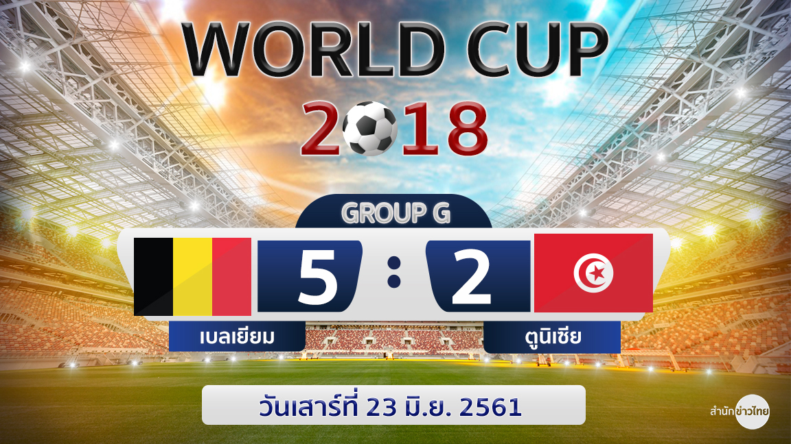 รัสเซีย 23 มิ.ย.-ฟุตบอลโลก 2018 ที่รัสเซีย กลุ่มG นัดที่2 เบลเยียม ถล่ม ตูนิเซีย 5-2 โดย เอเดน อาซาร์ และ โรเมลู ลูกากู ทำคนละ 2 ประตู