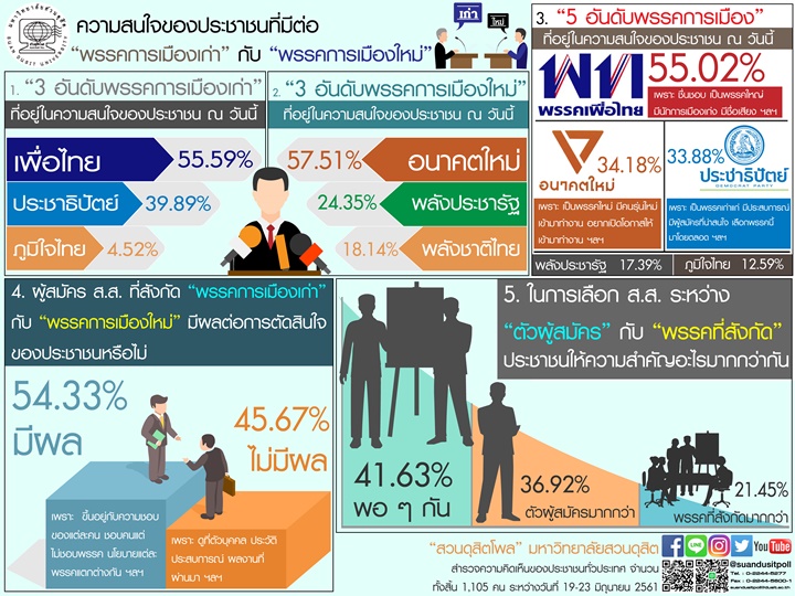 “สวนดุสิตโพล” มหาวิทยาลัยสวนดุสิต สำรวจความคิดเห็นของประชาชน หัวข้อ ความสนใจของประชาชนที่มีต่อ “พรรคการเมืองเก่า” กับ “พรรคการเมืองใหม่” จากประชาชนทั่วประเทศ จำนวน 1,105 คน สืบเนื่องจาก กระแสการเมืองในขณะนี้เป็นการเตรียมความพร้อมเข้าสู่การเลือกตั้งของพรรคการเมืองต่างๆ ที่เริ่มมีการเคลื่อนไหว ทั้งการดูดตัวผู้สมัครเข้าสู่พรรค การเตรียมตัวของพรรคการเมืองเก่า รวมถึงการเปิดตัวพรรคใหม่ เพื่อเป็นการสะท้อนความคิดเห็นของประชาชน