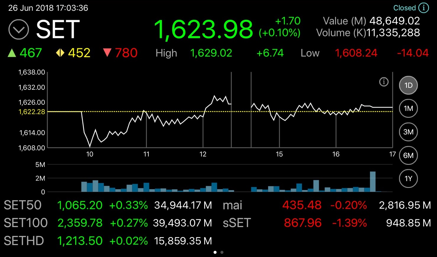 ผู้สื่อข่าวรายงานว่าดัชนีตลาดหลักทรัพย์ฯ ปิดที่ระดับ 1,623.98 จุด เพิ่มขึ้น 1.70 จุด หรือร้อยละ 0.10 มูลค่าการซื้อขาย 48,649.02 ล้านบาท การซื้อขายหุ้นไทยวันนี้ (26 มิ.ย.) ดัชนีผันผวนอยู่ในกรอบ โดยดัชนีแตะจุดสูงสุดที่ 1,629.02 จุด และต่ำสุดที่ระดับ 1,608.24 จุด นักลงทุนยังมีความกังวลต่อสงครามการค้าระหว่างสหรัฐและจีน