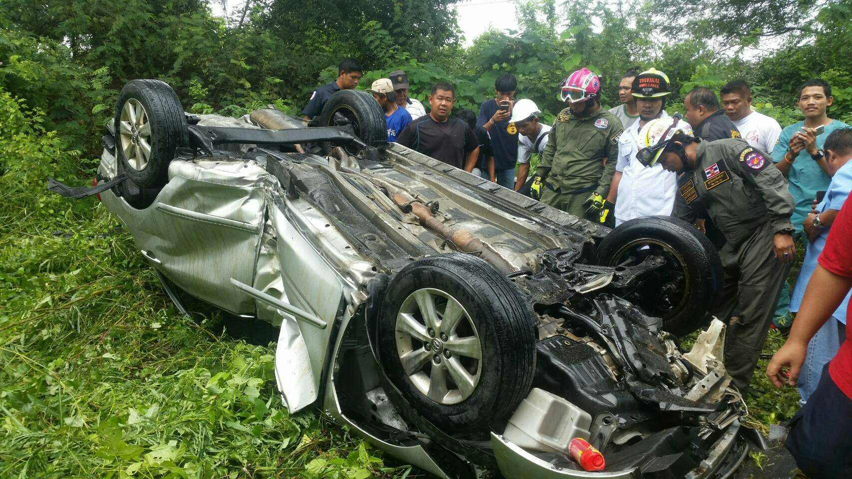 เมื่อเวลา 13.30 น. วันนี้ (23 ก.ย.) ร.ต.ท.หญิงจีรารัตน์ โพธิ์ติ รองสารวัตร (สอบสวน) สภ.สามโคก จ.ปทุมธานี รับแจ้งอุบัติเหตุรถยนต์เสียหลักชนขอบทางตกลงมาจากทางพิเศษอุดรรัถยา (บางพูน-ธรรมศาสตร์) อยู่ในป่าหญ้า บนถนนบางขันธ์-เชียงราก หมู่ 1 ต.เชียงรากใหญ่ อ.สามโคก จึงประสานมูลนิธิร่วมกตัญญูและแพทย์เข้าจุดเกิดเหตุ พบรถยนต์ ยี่ห้อโตโยต้า อัลติส สีบรอนซ์เงิน ทะเบียน 2 กม 3745 กรุงเทพมหานคร สภาพหงายท้อง หลังคายุบทั้งคันจากความสูงที่ตกลงมาประมาณ 15 เมตร ภายในรถคนขับเสียชีวิต คือ นายกอบโชค ประคุณวงศ์ อายุ 47 ปี ผู้จัดการธนาคารกรุงศรีอยุธยาจำกัด (มหาชน) สาขาตลาดพลู เจ้าหน้าที่ต้องใช้อุปกรณ์ตัดถ่าง เพื่อนำร่างออกจากซากรถ ท่ามกลางสายฝน