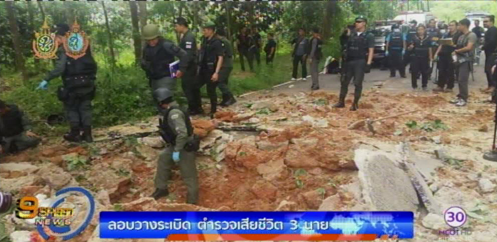 ยะลา 23 ก.ย.ฦ – คนร้ายลอบวางระเบิดและยิงซ้ำตำรวจชุดสืบสวน สภ.กรงปินัง จ.ยะลา ขณะออกปฏิบัติหน้าที่ด้วยรถกระบะ ที่บริเวณบ้านลูโบ๊ะกาโล หมู่ 4 ทำให้ตำรวจเสียชีวิต 3 นาย และบาดเจ็บ 2 นาย ถูกนำตัวส่งโรงพยาบาลศูนย์ยะลา. – สำนักข่าวไทย
