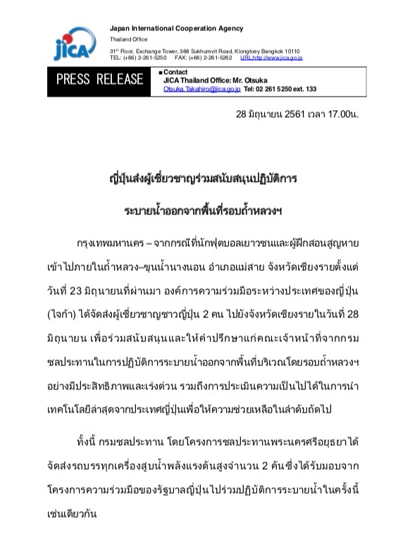 จากกรณีที่นักฟุตบอลเยาวชนและผู้ฝึกสอนสูญหายเข้าไปภายในถ้ำหลวง-ขุนน้ำนางนอน อำเภอแม่สาย จังหวัดเชียงราย ตั้งแต่วันที่ 28 มิถุนายนที่ผ่านม องค์การความร่วมมือระหว่างประเทศของญี่ปุ่น (ไจก้า) ได้จัดส่งผู้เชี่ยวชาญชาวญี่ปุ่น 2 คน ไปจังหวัดเชียงรายวันที่ 28 ถุนายน เพื่อร่วมสนับสนุนและให้คำปรึกษาแก่คณะเจ้าหน้าที่จากกรมชลประทานในการปฏิบัติการระบายน้ำออกจากพื้นที่บริเวณโดยรอบถ้ำหลวงอย่างมีประสิทธิภาพและเร่งด่วน รวมถึงการประเมินความเป็นไปได้ในการนำเทคโนโลยีล่าสุดจากประเทศญี่ปุ่น เพื่อให้ความช่วยเหลือลำดับถัดไป