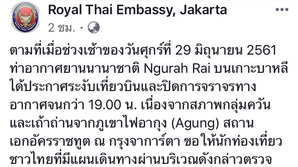 สถานเอกอัครราชทูตไทยประจำกรุงจาการ์ตา โพสต์ข้อความผ่านทางเฟซบุ๊ค ระบุว่า เมื่อช่วงเช้าของวันศุกร์ที่ 29 มิถุนายน 2561 ท่าอากาศยานนานาชาติ Ngurah Rai บนเกาะบาหลี ประเทศอินโดนีเซีย ได้ประกาศระงับเที่ยวบินและปิดการจราจรทางอากาศจนกว่าเวลา 19.00 น. เนื่องจากสภาพกลุ่มควันและเถ้าถ่านจากภูเขาไฟอากุง (Agung) บนเกาะบาหลีได้ปะทุและพ่นกลุ่มวันสูงกว่า 1,500 เมตร