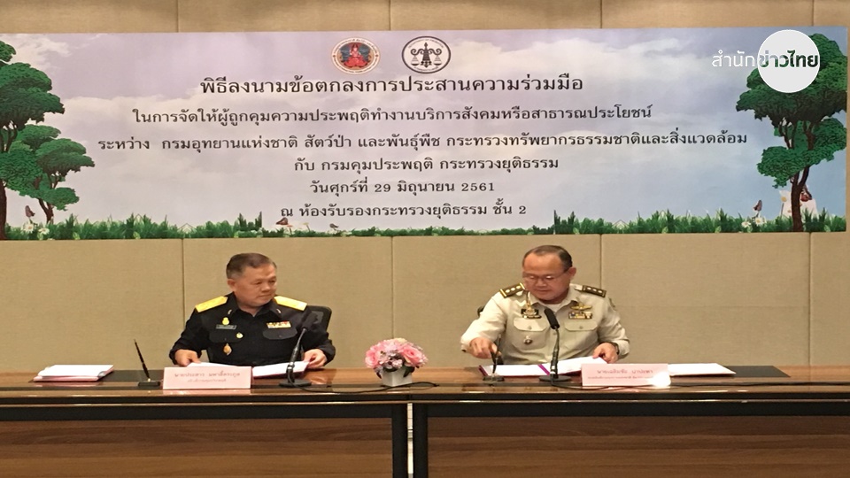 นายประสาร มหาลี้ตระกูล อธิบดีกรมคุมประพฤติ กระทรวงยุติธรรมและนายเฉลิมชัย ปาปะทา รองอธิบดีกรมอุทยานสัตว์ป่าและพันธุ์พืช ร่วมลงนามบันทึกข้อตกลงว่าด้วยการประสานความร่วมมือในการจัดให้ผู้ถูกคุมประพฤติทำงานบริการสังคมหรือทางสาธารณะประโยชน์