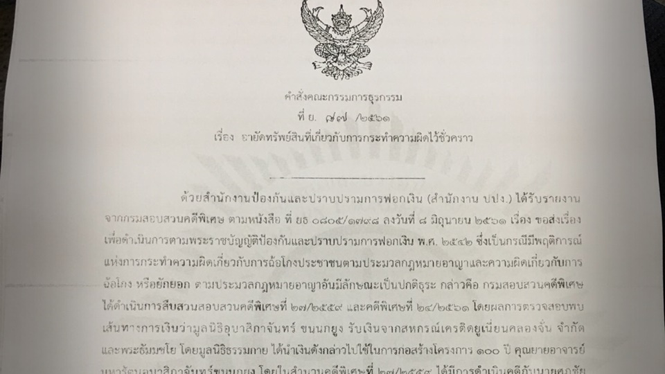 สำนักงานป้องกันและปราบปรามการฟอกเงิน (ปปง.) ลงประกาศในเว็บไซต์คำสั่งคณะกรรมการธุรกรรมที่ ย. 87/2561 เรื่องอายัดทรัพย์สินเกี่ยวกับการกระทำความผิดของนายศุภชัย ศรีศุภอักษร อดีตประธานสหกรณ์เครดิตยูเนี่ยนคลองจั่น จำกัด ในคดีฟอกเงินสหกรณ์เครดิตยูเนี่ยนคลองจั่น โดยในการประชุมคณะกรรมการธุรกรรมเมื่อวันที่ 12 มิ.ย.ที่ผ่านมา บอร์ด ปปง. มีมติให้อายัดอาคารโครงการ 100 ปีคุณยายอาจารย์มหารัตนอุบาสิกาจันทร์ขนนกยูง ตั้งอยู่บนโฉนดที่ดิน 91 แปลง ในชื่อมูลนิธิธรรมกาย และมูลนิธิธรรมประสิทธิ์