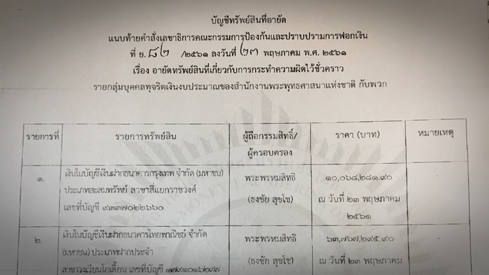 ปปง.29 มิ.ย.-ปปง.อายัดทรัพย์สินอดีตพระชั้นผู้ใหญ่ที่ถูกดำเนินคดีเงินทอนวัด กว่า 10 รายการ รวมมูลค่ากว่า 134ล้านบาท
