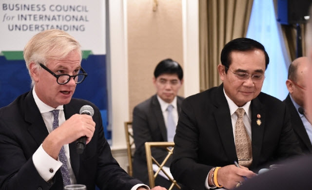 ขณะที่ ประธานบริหารสภา BCIU กล่าวขอบคุณ พร้อมชื่นชมความเป็นผู้นำของนายกรัฐมนตรี ประเทศไทยมีเสถียรภาพ รวมทั้ง การยกระดับเศรษฐกิจประเทศภายใต้ โครงการ Thailand 4.0 ทำให้เพิ่มโอกาส และลู่ทางการค้าและการลงทุนในไทยและภูมิภาคด้วย ธุรกิจของสหรัฐฯ ที่ลงทุนในไทยอยู่แล้ว กำลังพิจารณาขยายการค้าและการลงทุนอย่างต่อเนื่อง ในขณะที่ธุรกิจภาคบริการและค้าปลีกของสหรัฐฯ สนใจจะเข้าไปดำเนินธุรกิจ ทั้งการลงทุนโดยตรงและการร่วมทุน
