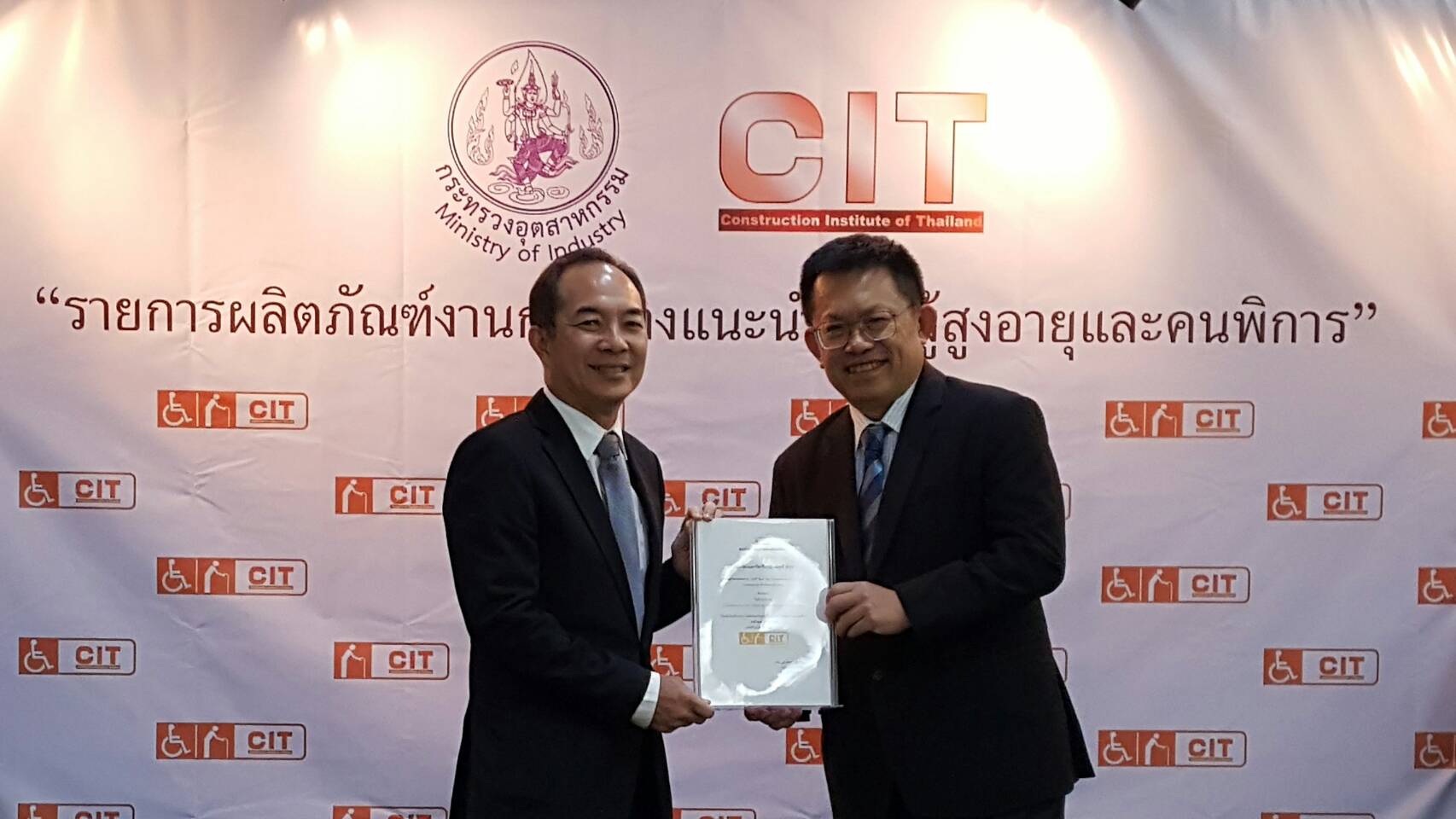 สถาบันการก่อสร้างแห่งประเทศไทย มอบ “เครื่องหมายผลิตภัณฑ์งานก่อสร้าง แนะนำสำหรับผู้สูงอายุและคนพิการ” ให้ผู้ประกอบการที่ได้รับตราสัญลักษณ์ จำนวน 3 บริษัท รวมสินค้า 14 รายการสินค้า ที่จะนำออกมาจำหน่ายในท้องตลาด เพื่อเป็นทางเลือกให้แก่ผู้สูงอายุและคนพิการ ตลอดจนผู้ดูแลผู้สูงอายุและคนพิการ โดยมีนายสมชาย หาญหิรัญ ปลัดกระทรวงอุตสาหกรรมเป็นผู้มอบ สำหรับบริษัทที่ได้รับเครื่องหมาย ได้แก่ บริษัท สยามซานิทารีแวร์อินดัสทรี จำกัด บริษัท สยามซานิทารีฟิตติ้งส์ จำกัด และบริษัท วชิรธร จำกัด