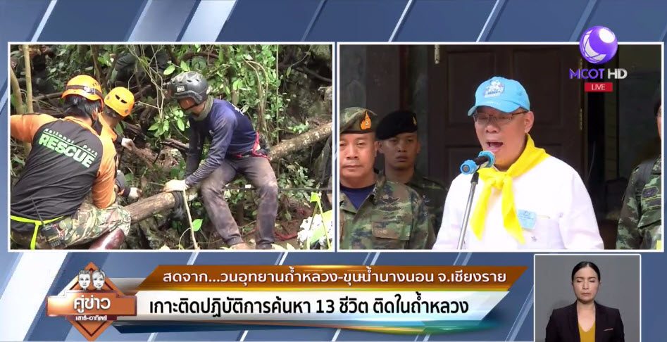 เชียงราย 1 ก.ค. – นายณรงค์ศักดิ์ โอสถธนากร ผู้ว่าราชการจังหวัดเชียงราย แถลงข่าวความคืบหน้าประจำวันในการช่วยเหลือ 13 ชีวิต เด็กติดถ้ำหลวง โดยภารกิจสำคัญคือการนำสูบน้ำออกจากถ้ำ ซึ่งเป็นอุปสรรคสำคัญ โดยเฉพาะขณะยังฝนยังตก อย่างไรก็ตาม ความตั้งใจที่จะทำวันนี้คือ การนำขวดอากาศไปเตรียมไว้จนถึง 3 แยก และลึกเข้าไปที่สุดเท่าที่สามารถจะทำได้ กับรอถังอากาศชุดใหม่มาเสริม จะทำเชือกนำทางเข้าไปจุด 3 แยก โดยหน่วยซีลเคลื่อนที่ด้วยการดำน้ำสลับกับว่ายน้ำ ปีนไปตามแนวผนังถ้ำเข้าหาจุดหมาย. -สำนักข่าวไทย