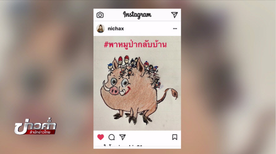 กทม. 1 ก.ค. – ทูลกระหม่อมหญิงอุบลรัตนราชกัญญา สิริวัฒนาพรรณวดี ทรงโพสต์อินสตาแกรมส่วนพระองค์ nichax เป็นภาพวาดฝีพระหัตถ์รูปหมูป่าน่ารัก และมีเหล่ากลุ่มนักฟุตบอลเยาวชนทีมหมูป่าอะคาเดมี พร้อมโค้ชรวม 13 คน อยู่บนตัวหมู ติดแฮชแท็กด้วยตัวอักษรสีแดง #พาหมูป่ากลับบ้าน สร้างความชื่นชมบนโลกโซเชียล พร้อมกันนี้ยังทรงอธิบายถึงที่มาของภาพดังกล่าวว่า อยากขอยืมรูปคนอื่น แต่เขียนเองคงดีกว่า สวยไม่สวยไม่ว่ากัน แต่มาจากใจจริง พร้อมลงรูปหัวใจปิดท้าย . – สำนักข่าวไทย