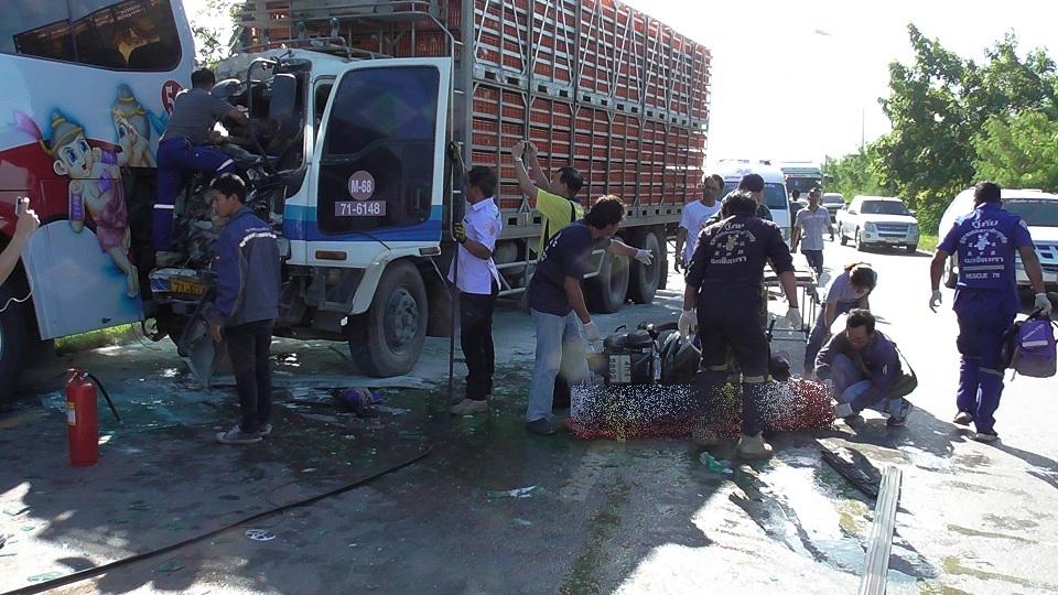 เมื่อเวลา 09.00 น. (2 ก.ค.) ร.ต.อ.สมศักดิ์ ศรีณรงค์ รองสารวัตร (สอบสวน) สภ.เมืองฉะเชิงเทรา และหน่วยกู้ภัยฉะเชิงเทรา ช่วยเหลืออุบัติเหตุรถสิบล้อบรรทุกไก่เบรกแตกชนรถหลายคันบนถนนสายเลี่ยงเมืองฉะเชิงเทรา เชิงสะพานแม่น้ำบางปะกง ทำให้การจราจรติดขัดยาวหลายกิโลเมตร เจ้าหน้าที่เร่งนำเครื่องมือตัดถ่างตัวรถบรรทกนำคนขับได้รับบาดเจ็บส่งโรงพยาบาลพุทธโสธร เบื้องต้นทราบว่ารถสิบล้อคันดังกล่าวแล่นข้ามสะพานแม่น้ำบางปะกงมาจากฝั่งคู่ขนานขาออกเมืองฉะเชิงเทรา ขณะจะลงเชิงสะพานได้พุ่งเข้าชนรถคันอื่นที่จอดติดไฟแดงมีทั้งรถยนต์ รถบัส รถกระบะ และรถจักรยานยนต์รวม 6 คัน มีผู้บาดเจ็บอีก 2 ราย รวมเป็น 3 ราย ส่วนสาเหตุคาดว่าระบบเบรกรถบรรทุกเกิดขัดข้อง ประกอบกับเป็นรถขนาดใหญ่น้ำหนักมาก จึงห้ามล้อไม่อยู่และพุ่งชนรถคันอื่นกลางถนน.-สำนักข่าวไทย