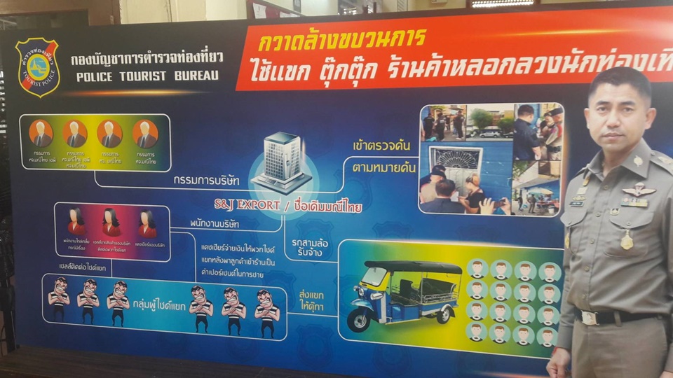 จากการสืบสวนขยายผลพบว่า ผู้ต้องหาที่เป็นคนไซด์แขก / คนขับรถตุ๊กตุ๊กและ ร้านค้าร่วมขบวนการมีทั้งร้านทัวร์ (Travel scam ) ได้แก่บริษัทรอยัล แทรเวลลิ่ง จำกัด ดำเนินคดี ตามพ.ร.บ.ธุรกิจนำเที่ยวและมัคคุเทศก์ มาตรา 34 ประกอบธุรกิจนำเที่ยวไม่จัดให้มีการประกันภัยสำหรับอุบัติเหตุให้แก่นักท่องเที่ยว มัคคุเทศก์ และผู้เที่ยว / ประเภท ร้านตัดสูท (Tailor scam) ได้แก่ เทเวศร์แฟชั่น รามแฟชั่นอินเตอร์เนชั่นแนล เจมส์แฟชั่น วาสนา และบีบีแฟชั่น ดำเนินคดีตามพ.ร.บ.คุ้มครองผู้บริโภค พ.ศ.2522 ขายสินค้าที่ควบคุมฉลากโดยไม่ติดฉลากสินค้า /พ.ร.บ.ศุลกากร ช่วยซ่อนเร้น ช่วยจำหน่ายซื้อหรือรับไว้โดยประการใดอันของตนพึงรู้ว่าเป็นของที่นำเข้ามาในราชอาณาจักรโดยมิได้ผ่านพิธีทางศุลกากร /ขายของโดยหลอกลวงให้ผู้อื่นหลงเชื่อในแหล่งกำเนิด สภาพ คุณภาพ หรือปริมาณแห่งของนั้นอันเป็นเท็จ สุดท้ายคือ ร้านเครื่องประดับเครื่องเพชร (Jewelry scam) ได้แก่ ร้านS&J EXPORT ซึ่งมีชื่อเดิม มณีไทย ดำเนินคดีในข้อหาอั้งยี่