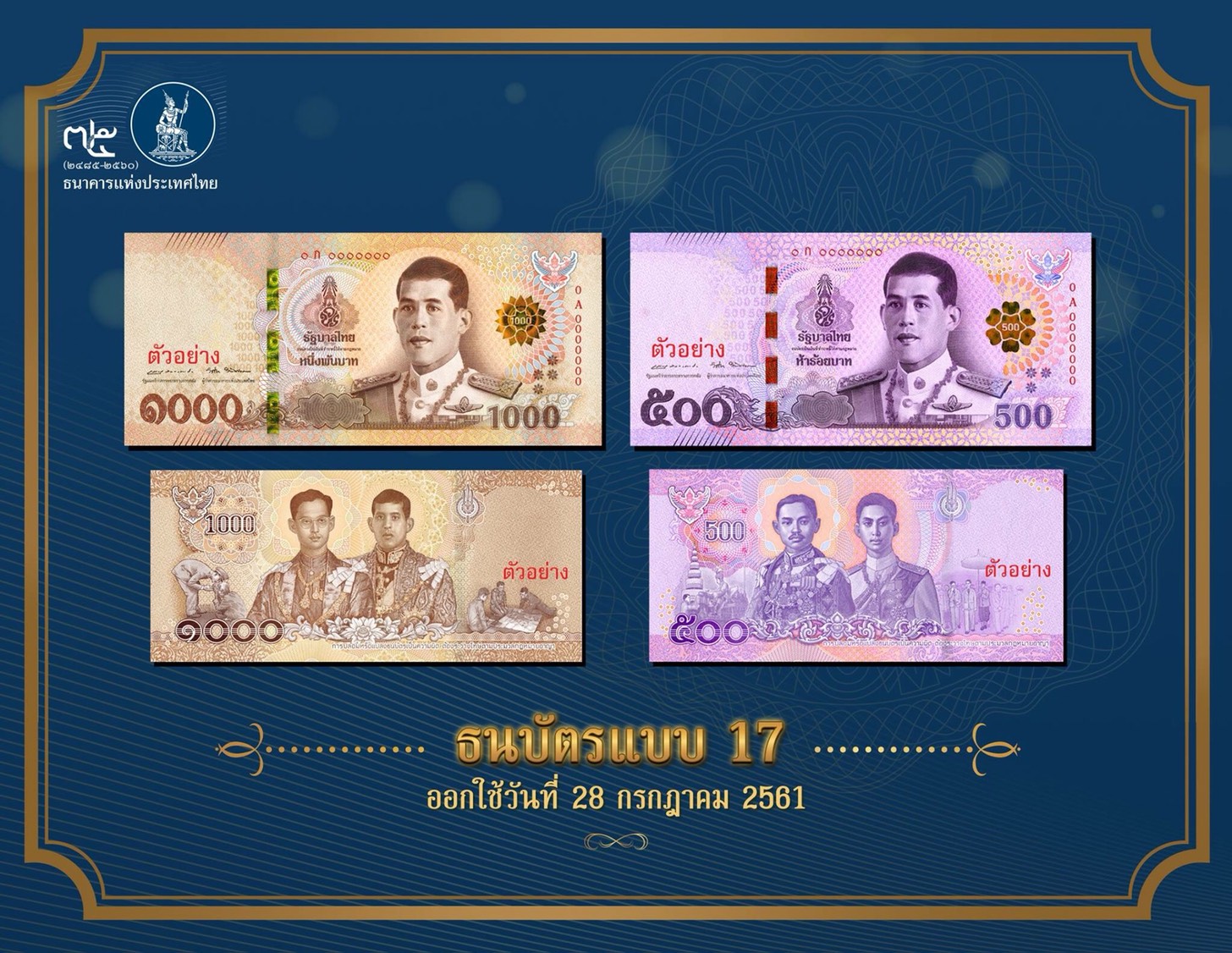นายวิรไท สันติประภพ ผู้ว่าการธนาคารแห่งประเทศไทย (ธปท.) เปิดเผยว่า ธปท.ออกใช้ธนบัตรแบบใหม่ แบบ 17 ชนิดราคา 500 บาท และ 1000 บาท ในวันเฉลิมพระชนมพรรษา สมเด็จพระเจ้าอยู่หัว มหาวชิราลงกรณ บดินทรเทพยวรางกูร วันที่ 28 กรกฎาคม 2561 เพื่อใช้เป็นธนบัตรหมุนเวียนทั่วไป