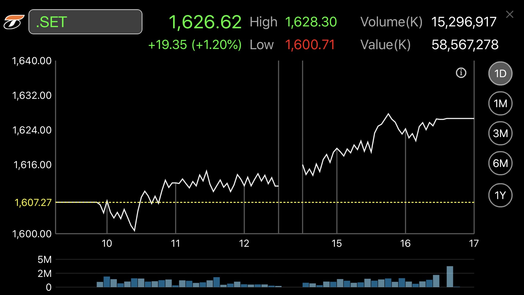 ผู้สื่อข่าวรายงานว่าดัชนีตลาดหลักทรัพย์ฯ ปิดการซื้อขายวันนี้ (3 ก.ค.) ที่ระดับ 1,626.62 จุด เพิ่มขึ้น 19.35 จุด หรือร้อยละ 1.20 มูลค่าการซื้อขาย 58,567.28 ล้านบาท การเคลื่อนไหวของหุ้นไทยในช่วงเช้าปรับลดลง แต่ช่วงบ่ายดัชนีปรับตัวขึ้นแรง สูงสุดของวันที่ระดับ 1,628.30 จุด และต่ำสุดของวันที่ระดับ 1,600.71 จุด