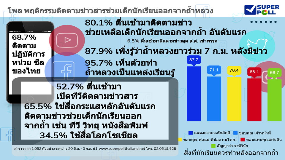นายนพดล กรรณิกา ผู้อำนวยการ สำนักวิจัยซูเปอร์โพล(SUPER POLL) มูลนิธิ สถาบันวิจัยความสุขชุมชนและความเป็นผู้นำ เปิดเผยผลสำรวจ เรื่องโพล พฤติกรรมคนติดตามข่าวสารช่วยเด็กนักเรียนออกจากถ้ำหลวง กรณีศึกษาตัวอย่างประชาชนทุกสาขาอาชีพ จำนวน1,052 ตัวอย่าง โดยดำเนินโครงการระหว่างวันที่ 20 มิ.ย.–3 ก.ค.2561ที่ผ่านมา เกินครึ่งหรือร้อยละ 52.7 ตื่นเช้าขึ้นมา เปิดโทรทัศน์รับข่าวสาร เป็นอันดับแรก รองลงมาคือ ร้อยละ 39.7 เปิดโทรศัพท์มือถือ และรองๆ ลงไปคือ วิทยุ คอมพิวเตอร์ และหนังสือพิมพ์ ตามลำดับ