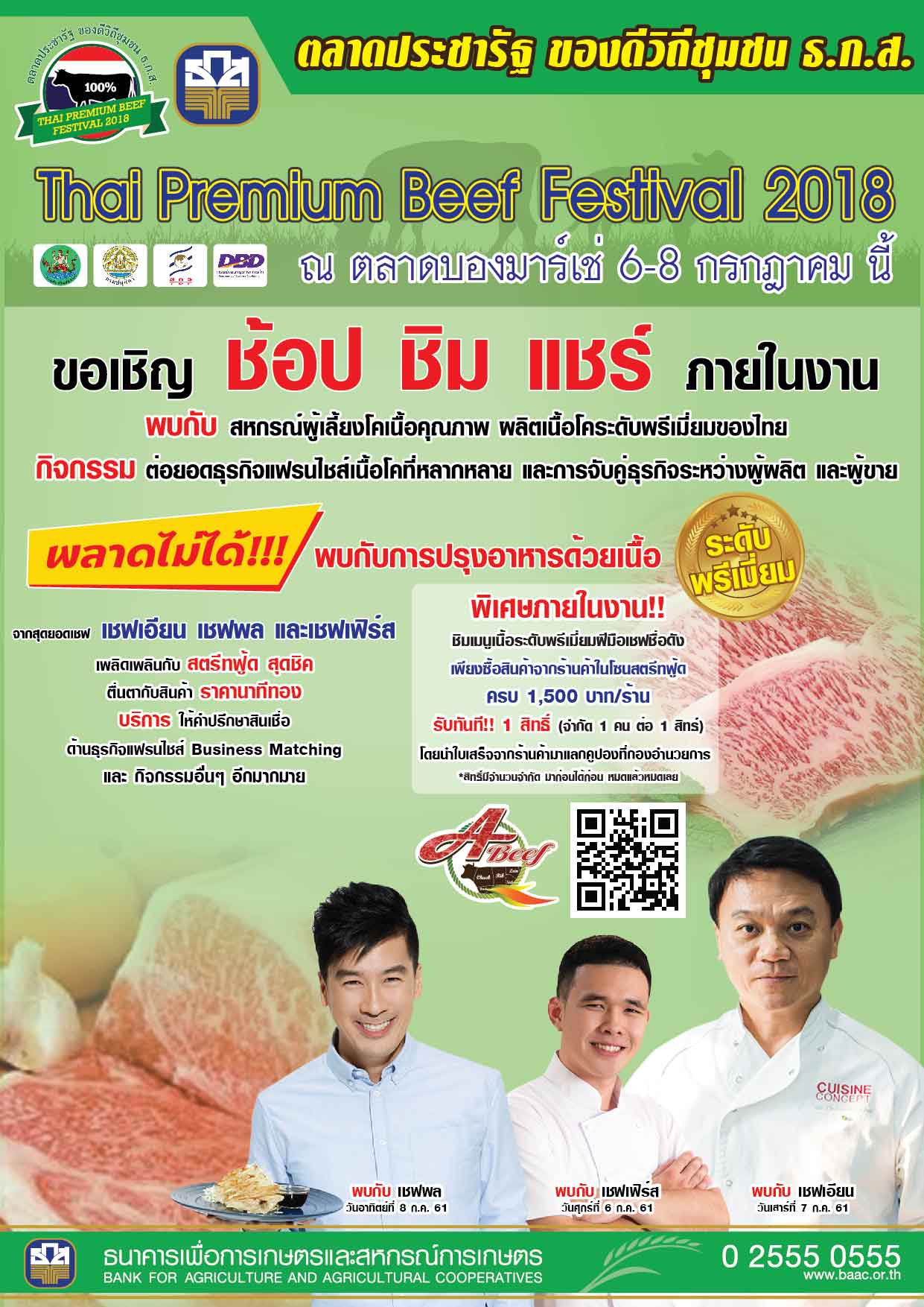 นายมรกต พิธรัตน์ รองผู้จัดการ ธนาคารเพื่อการเกษตรและสหกรณ์การเกษตร (ธ.ก.ส.) กล่าวว่า ธ.ก.ส. จะจัดงานตลาดประชารัฐ ของดีวิถีชุมชน Thai Premium Beef Festival 2018 ระหว่างวันที่ 6 – 8 กรกฎาคม 2561 ตลาดบองมาร์เช่ เพื่อประชาสัมพันธ์ให้ประชาชนรับรู้และเห็นถึงศักยภาพการผลิตโคเนื้อและการแปรรูปเนื้อโคในประเทศไทยที่มีคุณภาพดีเยี่ยมทัดเทียมเนื้อที่นำเข้าจากต่างประเทศ ซึ่งนอกจากเป็นการส่งเสริมการบริโภคสินค้าที่ผลิตในประเทศไทย เพื่อทดแทนการนำเข้าแล้ว ยังเป็นการสนับสนุนให้เกษตรกรผู้เลี้ยงโคในประเทศมีช่องทางจำหน่ายสินค้า มีการพัฒนาผลิตภัณฑ์รูปแบบต่าง ๆ เพื่อสร้างมูลค่าเพิ่มและตรงกับความต้องการของตลาด รวมถึงการสนับสนุนให้เกษตรกรปรับตัวรองรับการแข่งขันเปิดเสรีการค้า (เอฟทีเอ) ปี 2563 ที่ส่งผลให้ภาษีนำเข้าโคเนื้อเป็นศูนย์