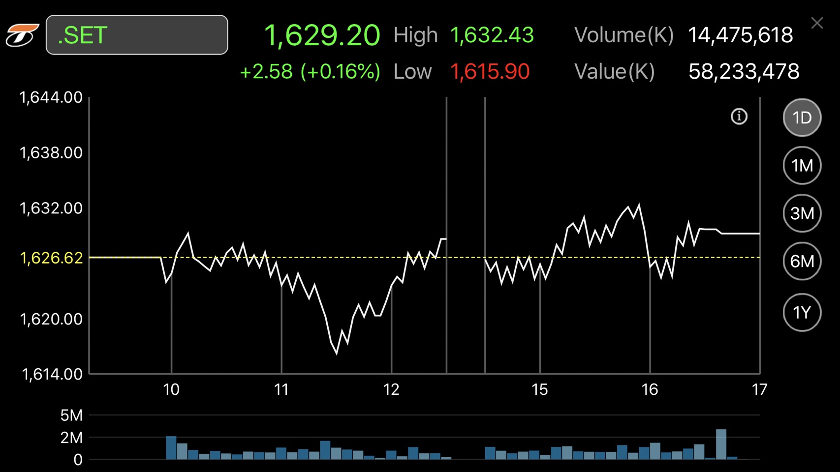 ผู้สื่อข่าวรายงานว่า การซื้อขายหุ้นวันนี้ ดัชนีหุ้นไทยเคลื่อนไหวทั้งในแดนบวก-ลบ โดยดัชนีฯแตะจุดสูงสุดที่ 1,632.43 จุด และแตะจุดต่ำสุดที่ระดับ 1,615.90 จุด