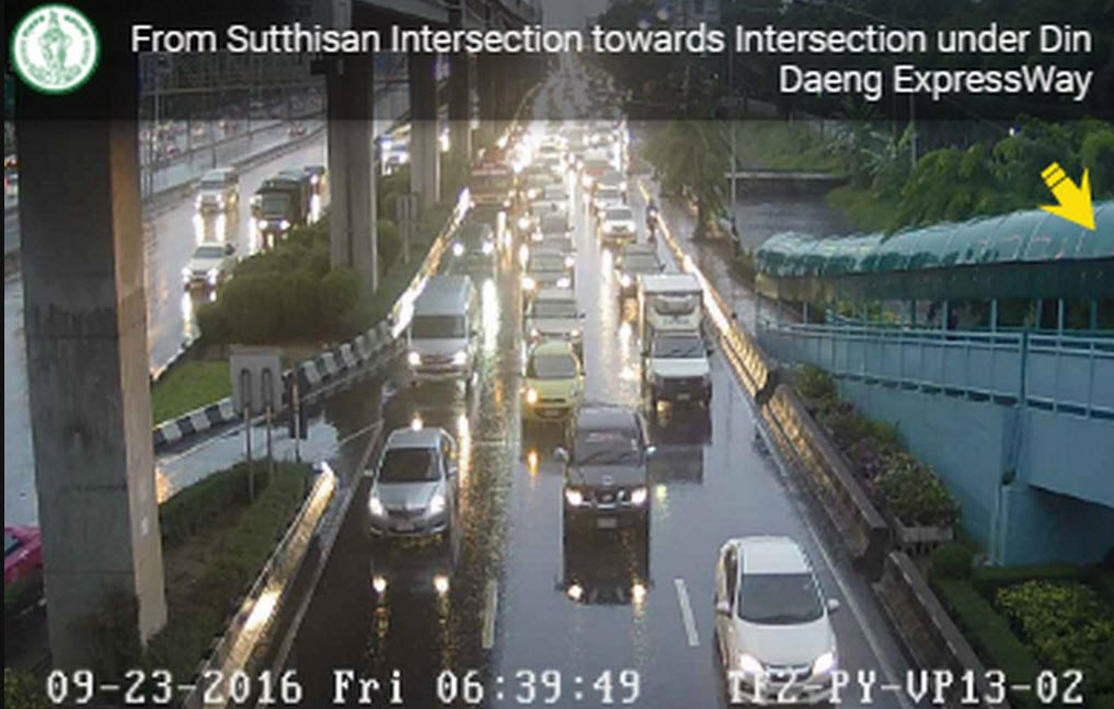 สภาพการจราจร ถนนวิภาวดีรังสิต ขาเข้า จากแยกสุทธิสาร มุ่งหน้าแยกใต้ด่วนดินแดง รถหนาแน่นเคลื่อนตัวช้า ท้ายสะสมหน้าโรงเรียนสุรศักดิ์มนตรี