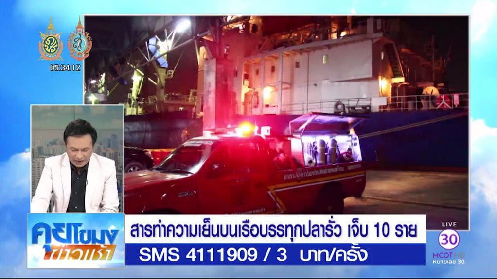 สมุทรปราการ 23 ก.ย.-สารทำความเย็นบนเรือบรรทุกอาหารทะเลสดรั่วไหล ขณะจอดเทียบท่าย่านพระประแดง ทำให้ลูกเรือบาดเจ็บ 10 ราย ในจำนวนนี้สาหัส 3 ราย