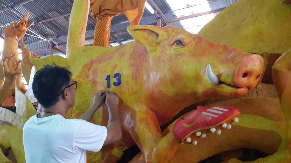 นายเทียน เลิศศรีศิลป์ อายุ 47 ปี หัวหน้าช่างแกะสลักขบวนเทียนพรรษาวัดโพธิ์ กล่าวว่า การแกะสลักรูปทีมหมูป่าอะคาเดมี่ไว้ในขบวนเทียนพรรษาปีนี้ เพื่อแสดงถึงความห่วงใย แม้จะอยู่ต่างพื้นที่ แต่ทุกคนคอยเป็นกำลังใจให้ออกจากถ้ำมาอย่างปลอดภัย นอกจากนี้ ในขบวนเทียนพรรษาปีนี้ยังการแกะสลักรูปคล้ายนายกรัฐมนตรีในอริยาบทปั่นสามล้อ พร้อมรูปปั้นศิลปินแห่งชาติและศิลปินพื้นบ้านนั่งด้านท้าย เช่น อ.ทวี รัชนีกร กำปั่น บ้านแท่น และสุนารี ราชสีมา.-สำนักข่าวไทย