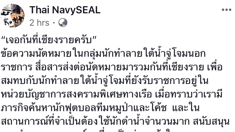 กรุงเทพฯ 6 ก.ค.- เพจ Thai NavySEAL โพสต์อาลัยถึง“จ่าเอกสมาน กุนัน” นักทำลายใต้น้ำจู่โจม รุ่นที่ 30 นักกีฬาไตรกีฬา ย้ำ จะทำภารกิจช่วยทีมหมูป่าให้สำเร็จ สมดั่งที่สมานตั้งใจไว้
