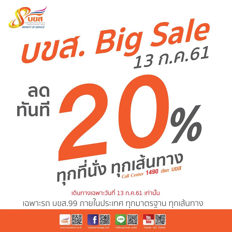 นายจิรศักดิ์ เยาว์วัชสกุล กรรมการผู้จัดการใหญ่ บริษัท ขนส่ง จำกัด (บขส.) กล่าวว่า เพื่อเป็นการขอบคุณและสมนาคุณให้แก่ลูกค้าที่ได้ให้การสนับสนุน บขส. ด้วยดีเสมอมา และวันที่ 13 กรกฎาคม 2561 เป็นวันคล้ายวันสถาปนา บขส. ครบรอบ 88 ปี จึงจัดโปรโมชั่นพิเศษ “Big Sale” มอบส่วนลดค่าโดยสารร้อยละ 20 จากราคาหน้าตั๋ว สำหรับเส้นทางภายในประเทศ ให้แก่ผู้โดยสารที่เดินทางวันที่ 13 กรกฎาคม 2561 เท่านั้น โดยผู้โดยสารสามารถซื้อตั๋วล่วงหน้าและซื้อตั๋ววันเดินทางได้ที่ช่องจำหน่ายตั๋วและสถานีเดินรถ บขส. ทั่วประเทศ ทั้งนี้ โปรโมชั่นดังกล่าวไม่สามารถใช้กับรถโดยสารที่มีการจำหน่ายตั๋วบนรถ รถโดยสารระหว่างประเทศ และเมื่อซื้อตั๋วแล้วไม่สามารถเปลี่ยนแปลงการเดินทางได้ รวมทั้งไม่สามารถใช้ร่วมกับรายการส่งเสริมการขายอื่น ๆ สอบถามข้อมูลเพิ่มเติมได้ที่ Call Center 1490 เรียก บขส. ตลอด 24 ชั่วโมง หรือที่ ช่องจำหน่ายตั๋ว บขส. ทั่วประเทศ.-สำนักข่าวไทย