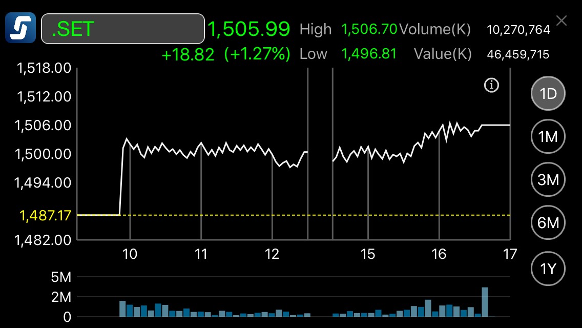 ตลาดหลักทรัพย์ ปิดตลาดการซื้อขายวันนี้ที่ระดับ 1,505.99 จุด เพิ่มขึ้น 18.82 จุด หรือ ร้อยละ 1.27 มูลค่าการซื้อขาย 46,459.72 ล้านบาท