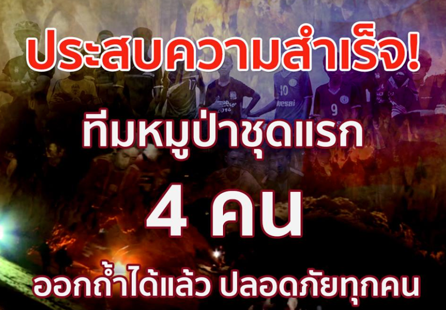 เป็น 16 วันแห่งการรอคอยที่คุ้มค่าที่สุด หลังจากทุกฝ่ายได้ปฏิบัติการอย่างเต็มที่ วันนี้มีความพร้อมทั้งระดับน้ำที่ลดลงไปมาก อากาศที่เอื้ออำนวย สภาพร่างกายและจิตใจของเด็กและพ่อแม่ และทีมบุคลากรที่ทำงาน ซึ่งภารกิจมีทั้งหมด 3 ระยะ คือ ค้นหา กู้ภัย และส่งกลับ ซึ่งสามารถกู้ภัยและส่งตัวน้องๆ 4 คนแรกถึงโรงพยาบาลเชียงรายประชานุเคราะห์อย่างปลอดภัยทุกคน ปฏิบัติการดังกล่าวใช้เจ้าหน้าที่เทคนิคดำน้ำ 13 คน โดย 10 คน เป็นนักดำน้ำ อีก 3 คน เป็นฝ่ายเทคนิค มีเจ้าหน้าที่หน่วยซีลไทย 5 นาย เจ้าหน้าที่ดำน้ำกว่า 90 คน ในจำนวนนี้เป็นชาวต่างประเทศกว่า 50 คน และคนไทยกว่า 40 คน โดยใช้วิธีให้เด็กเกาะอยู่ข้างใต้ตัวเทคนิค ใส่หน้ากากกันน้ำเข้า มีระบบหายใจตามปกติ ให้น้องอยู่ข้างใต้และกอดน้องออกมา ปฏิบัติการวันนี้ประสบความสำเร็จมากกว่าที่คาด คนแรกออกมาจากถ้ำเมื่อเวลา 17.40 น. คนที่สองออกมาหลังจากนั้น 20 นาที นำตัวส่งโรงพยาบาลเชียงรายประชานุเคราะห์โดยรถพยาบาลต่อด้วยเฮลิคอปเตอร์ ส่วนคนที่ 3 และ 4 ออกมาในเวลา 19.40 น.และ 19.50 น.