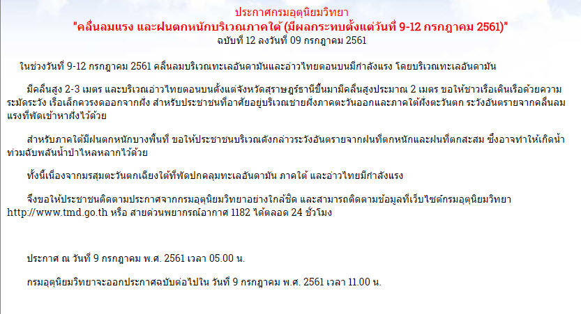 ส่วนคลื่นลมแรงและฝนตกหนักบริเวณภาคใต้ ในช่วงวันที่ 9-12 กรกฎาคม 2561 คลื่นลมบริเวณทะเลอันดามันและอ่าวไทยตอนบนมีกำลังแรง โดยบริเวณทะเลอันดามันมีคลื่นสูง 2-3 เมตร และบริเวณอ่าวไทยตอนบนตั้งแต่ จ.สุราษฎร์ธานี ขึ้นมามีคลื่นสูงประมาณ 2 เมตร ขอให้ชาวเรือเดินเรือด้วยความระมัดระวัง เรือเล็กควรงดออกจากฝั่ง สำหรับประชาชนที่อาศัยอยู่บริเวณชายฝั่งภาคตะวันออกและภาคใต้ฝั่งตะวันตก ระวังอันตรายจากคลื่นลมแรงที่พัดเข้าหาฝั่งไว้ด้วย