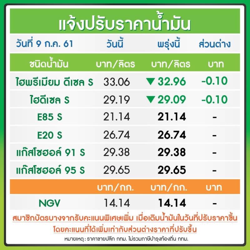 ผู้สื่อข่าวรายงานว่าบริษัท บริษัท ปตท.น้ำมันและการค้าปลีก หรือพีทีทีโออาร์ และ บมจ.บางจากฯ ประกาศปรับลดราคาดีเซล 10 สตางค์ต่อลิตร ส่วนเบนซินและแก๊สโซฮอล์ คงเดิม มีผลวันพรุ่งนี้ (10 ก.ค.) ราคาใหม่ในเขตกรุงเทพฯ และปริมณฑล ดังนี้ เบนซิน 95 ลิตรละ 36.76 บาท แก๊สโซฮอล์ 95 ลิตรละ 29.65 บาท แก๊สโซฮอล์ 91 ลิตรละ 29.38 บาท E20 ลิตรละ 26.74 E85 ลิตรละ 21.14 และดีเซล 29.09 บาทต่อลิตร (ราคาขายปลีกข้างต้นยังไม่รวมภาษีบำรุงกรุงเทพมหานคร ).-สำนักข่าวไทย