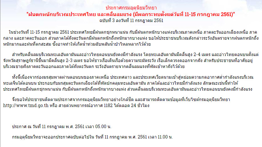 กทม. 11 ก.ค. – กรมอุตุนิยมวิทยาประกาศเตือนฝนตกหนักบริเวณประเทศไทย และคลื่นลมแรง ช่วงวันที่ 11-15 กรกฎาคม 2561 ประเทศไทยมีฝนตกชุกหนาแน่น กับมีฝนตกหนักบางแห่งบริเวณภาคเหนือ ภาคตะวันออกเฉียงเหนือ ภาคกลาง และภาคตะวันออก ส่วนภาคใต้ฝั่งตะวันตกมีฝนตกหนักถึงหนักมากบางแห่ง ขอให้ประชาชนบริเวณดังกล่าวระวังอันตรายจากฝนตกหนักถึงหนักมากและฝนที่ตกสะสม อาจทำให้เกิดน้ำท่วมฉับพลันน้ำป่าไหลหลากไว้ด้วย