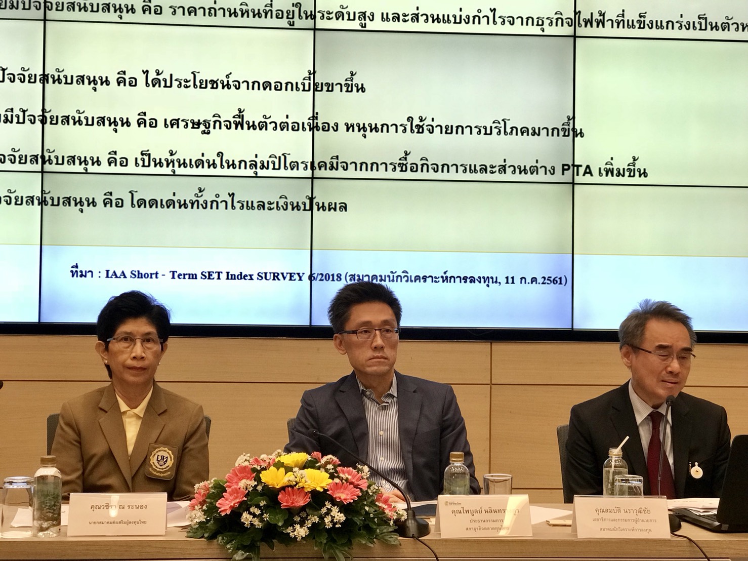 นายสมบัติ นราวุฒิชัย เลขาธิการและกรรมการผู้อำนวยการสมาคมนักวิเคราะห์การลงทุน กล่าวว่า ผลสำรวจความเห็นนักวิเคราะห์และผู้จัดการกองทุน คาดว่าดัชนีหุ้นไทยระยะสั้นเป็นไปในทิศทางบวก ดัชนีสิ้นเดือนกรกฎาคมเฉลี่ยอยู่ที่ 1,629 จุด ปัจจัยที่มีผลต่อหุ้นไทยระยะสั้น คือ ปัญหาสงครามการค้า ผลการดำเนินงานไตรมาส 2 กระแสการเคลื่อนย้ายเงินทุนต่างชาติ และการลงทุนของกองทุน โดยคาดหุ้นไทยจะกลับมาดีขึ้นในช่วงเดือนพฤศจิกายนและธันวาคม 2561 ส่วนเป้าหมายดัชนีหุ้นไทยสิ้นปี 2561 อยู่ที่ 1,795 จุด ลดลง 65 จุด จากการสำรวจเมื่อเดือนมิถุนายนที่คาดว่าดัชนีหุ้นไทยสิ้นปีนี้อยู่ที่ 1,860 จุด โดยดัชนีหุ้นไทยมีจุดต่ำสุดที่ 1,557 จุด และมีจุดสูงสุดที่ 1,798 จุด ส่วนคาดการณ์กำไรสุทธิ คาดว่าเติบโตร้อยละ 10.78 ลดลงจากครั้งก่อนที่ร้อยละ 11.04 โดย 5 หุ้นเด่น คือ BANPU , BBL , CPALL , IVL ,LH.- สำนักข่าวไทย