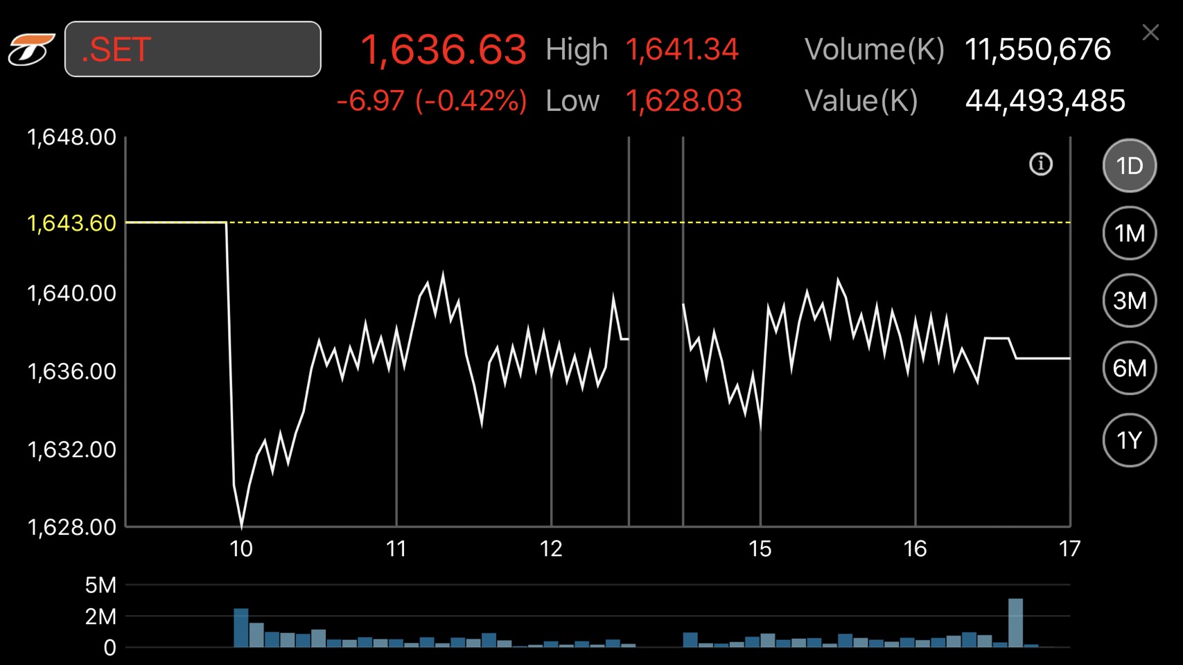 ผู้สื่อข่าวรายงานว่าดัชนีตลาดหลักทรัพย์ฯ ปิดวันนี้ (11 ก.ค. ) ที่ระดับ 1,636.63 จุด ลดลง 6.97 จุด หรือร้อยละ 0.42 มูลค่าการซื้อขาย 44,493.49 ล้านบาท การซื้อขายหุ้นวันนี้ดัชนีเคลื่อนไหวในแดนลบตลอดทั้งวัน โดยดัชนีฯ แตะจุดสูงสุดที่ 1,641.34 จุด และต่ำสุดที่ระดับ 1,628.03 จุด