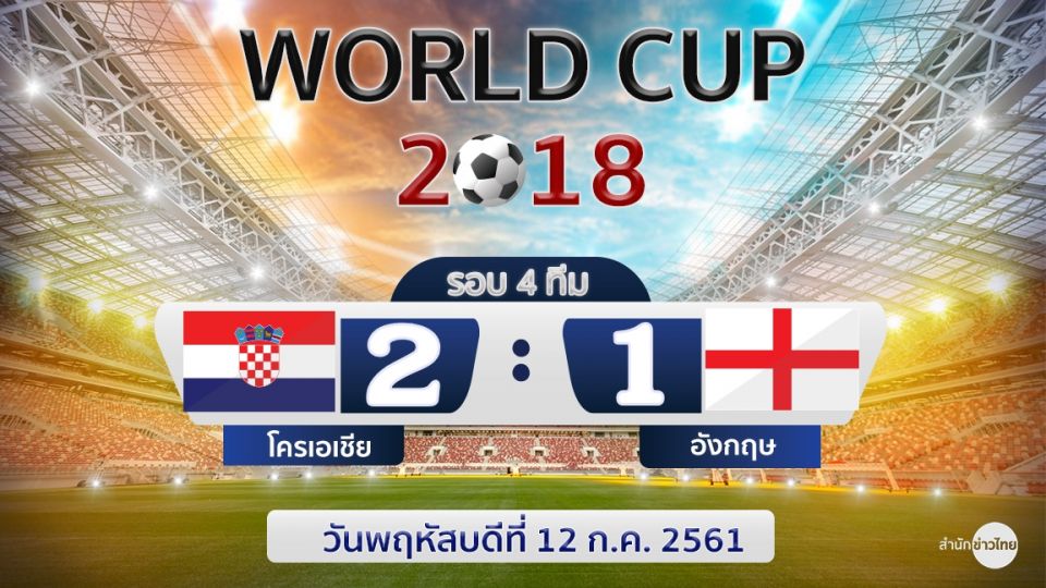 นาทีที่ 109 อีวาน เปริซิช แมน ออฟ เดอะ แมชท์ ในนัดนี้ โหม่งต่อให้ มาริโอ มานด์ซูคิช สอดเข้าไปยิงด้วยซ้าย เป็นประตูชัยช่วยให้โครเอเชีย เฉือนเอาชนะไปได้ 2-1 (มีภาพช้า)ผ่านเข้ารอบชิงชนะเลิศไปลุ้นแชมป์โลกสมัยแรก กับ ฝรั่งเศส ในวันที่ 15 กรกฎาคมนี้ เวลา 22 นาฬิกา ส่วนอังกฤษ ไปชิงที่ 3 กับ เบลเยี่ยม ในวันที่ 14 กรกฎาคมนี้ เวลา 21.00 น. – สำนักข่าวไทย